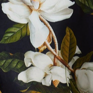 The subtle sheen of this incredibly soft silk satin highlights the flutter of every movement. A burst of a white flower bouquets against deep black is a bold and elegant study in contrasts. A most sumptuous evening statement. The belt creates the illusion of a smaller waist, even on waists that are not actually small as visually the bow anchors the center.