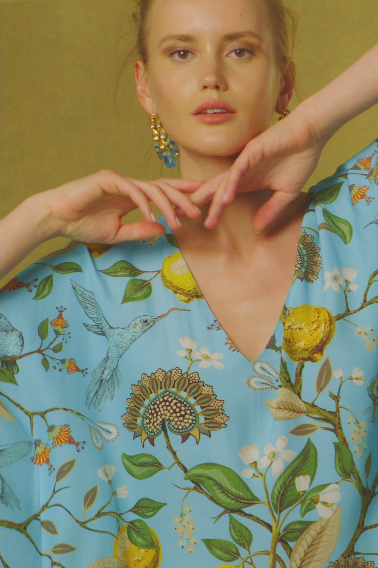 Like stepping into a magical garden fragrant with citrus blossoms, our Flora Kaftan evokes sun-kissed days in Portofino. Hummingbirds –symbolizing joy, good luck and healing– nestle amongst lemon groves. A most versatile kaftan that can be worn day to night.