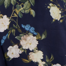 A secret garden of white English roses with fluttering butterflies rests on a bed of midnight navy. Crafted from beautifully draping silk, it feels incredibly soft. A romantic dress that that is perfect for garden formal occasions.